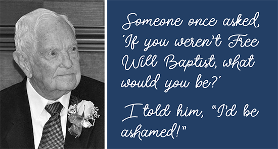 Since 1946—75 years. I pastored 65 of those years. Preached ‘til I was 99. But I’m retired now. Someone once asked me, “If you weren’t Free Will Baptist, what would you be?” I told him, “I’d be ashamed.”