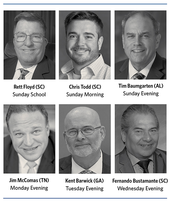 Sunday morning, Rett Floyd (SC) and Chris Todd (SC) will explore going the extra mile to practice forgiveness (Luke 15:11-32). Sunday evening, Tim Baumgarten (AL) will look at going the extra mile by protecting our Christian family (Romans 14). Monday evening, Jim McComas (TN) will challenge listeners to go the extra mile by reaching the hurting (Luke 8:40-46), followed by Kent Barwick (GA) Tuesday, who will examine going the extra mile to reach those difficult to reach (John 4). During the Wednesday evening missions service, Fernando Bustamante (SC) will offer a final challenge to leave our comfort zones and go the extra mile to take the gospel to the ends of the earth (Acts 10).