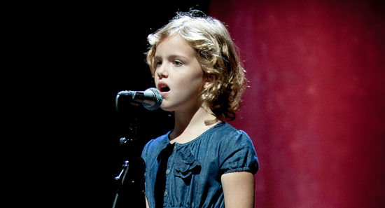 • The pure voice of seven-year-old Emmy McGee starts the 2012 D6 Conference with the haunting refrain of the old gospel song, “Nothing But the Blood.” Christian musician Aaron Shust accompanies her before leading worship.