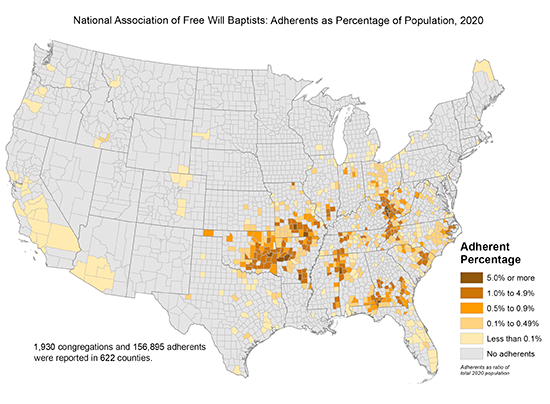 Recently, I received the U.S. Religion Census results. [2] The map below shows a county-level compilation of Free Will Baptist (reporting) congregations compared to the population of their counties.