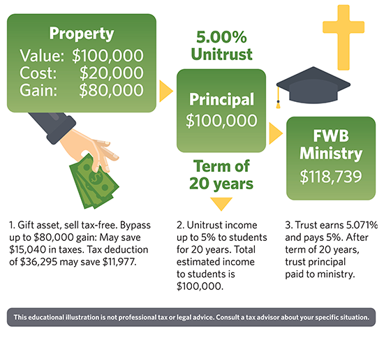 This is done by setting aside a large ($100,000 or more) asset that can pay an earnings rate to a grandchild or a series of grandchildren over a defined period of 20 years or less. When the defined period expires, the asset goes to any Free Will Baptist ministry you choose. Over a 20-year period, a $100,000 gift will provide approximately $100,000 to your grandchildren while still providing $100,000 to ministry.