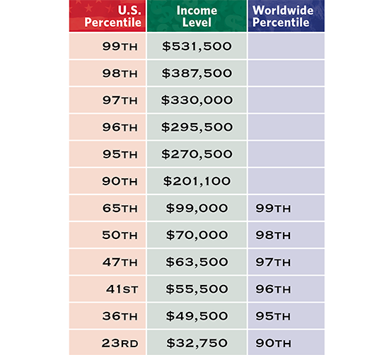 However, if we evaluate income on a global level, we see a very different picture. A household only needs to earn $32,750 to reach the 90th percentile worldwide. This becomes even more dramatic as household incomes increase. Household income of $49,500 is in the 95th percentile; $55,500 the 96th percentile; $63,500 the 97th percentile; $70,000 the 98th percentile; and $99,000 the 99th percentile.