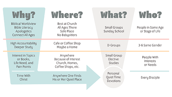 With the communities identified, ask where do these communities meet? Utilize the natural gatherings of your church for intentional discipleship. You want everyone gathering for worship, but growth and connection will occur in smaller settings. Use small groups/Sunday School classes for people grouped by similar life stages and study an age-aligned curriculum that starts at church but carries over into the home. Each group must aspire to connecting all ages around the Word by teaching the same theme or topic. Then four to six adults of the same gender from their small group can form D-Groups and pursue deeper study and establish higher accountability.