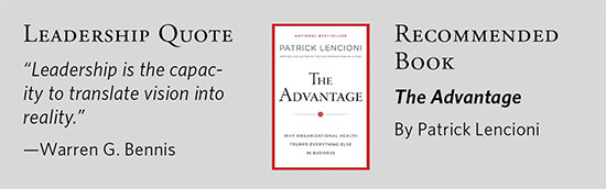 The column "Leadership Whiteboard" provides a short visual leadership coaching moment. It introduces and explains a new sketch in each issue, provides leadership coaching for further development, and shares a leadership quote and recommended book.