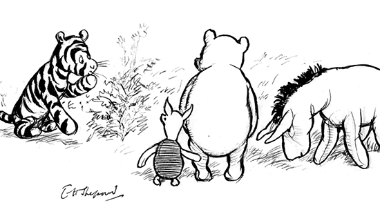 Illustration by E. H. Shepard. Appears on page 29 of A.A. Milne's book, The House at Pooh Corner in Chapter 2.