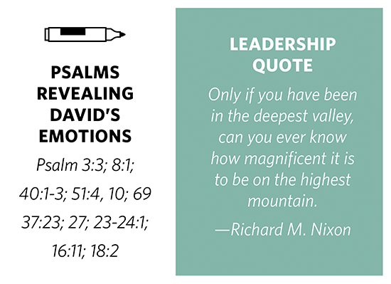 Certainly, none of us will write psalms to be added to the canon of Scripture; and few of us will publish an autobiography. However, praying and sharing with close friends can help us through the horrible pits. May these words penned by the leader David (see list at right) encourage you as you experience the ups and downs of life and leadership.