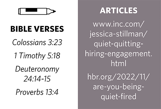 Neither quiet quitting nor quiet firing is biblical. God’s Word says a worker is worthy of his hire (an appropriate paycheck), and workers should not be sluggards. A pastor’s call means his work is more than a job; it’s an inspired investment, even when not reciprocated. Churches, while you expect your pastor to give his all, you should do the same through support, volunteering, and providing for his family.