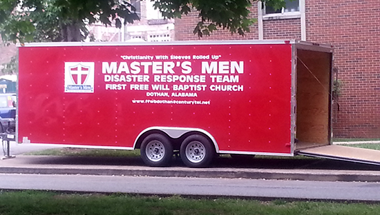 Tim, the ever-busy Master’s Man, and sidekick Eric Thomas had been sent by the Master’s Men of First FWB Church in Dothan, Alabama, to pull the Disaster Relief trailer to Nashville. In Tim’s own words, the purpose of the trip was prompted by the desire to “Make it a joy to send a student to Welch College.”