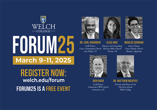 Welch College will host the annual Forum25 conference March 9-11, 2025. Speakers will include Dr. Carl Hargrove, staff pastor at Grace Community Church in Sun Valley, California; Eliza Huie, director of counseling at McLean Bible Church in Vienna, Virginia; Nicolas Serrano, senior pastor of Grace Family Church in Rosaria, Argentina; Josh Baer, pastor of Cramerton FWB Church in Cramerton, North Carolina; and Welch Provost Dr. Matthew McAffee.