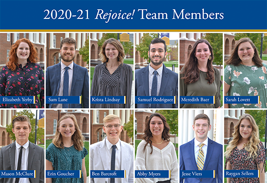 Gallatin, TN—The 2020-2021 Rejoice! Ministry Team has been selected, according to Daniel Webster, director. “After extensive tryouts and interviews, I’m pleased to announce final selections for this year’s team. We had a great number of quality musicians to choose from, but we finally selected these students to be our representatives for this year.”