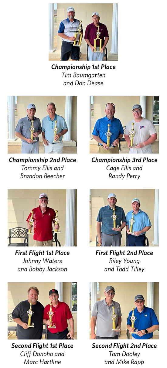 In one of the closest finishes in the tournament’s history, Tim Baumgarten and Don Dease finished a single stroke ahead of second-place team Tommy Ellis and Brandon Beecher, followed by Cage Ellis and Randy Perry to round out the championship flight.