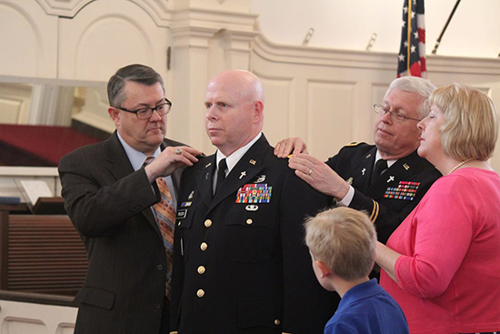 Family, friends, fellow chaplains, chaplain assistants, civilian employees, and members of the local community and churches gathered to celebrate this special day with David and Connie. A chaplain assistant, a true “battle buddy,” who had deployed and served in combat in Afghanistan with David, got up early and left Fort Jackson, South Carolina, at 4:00 a.m. that morning to arrive for the 11:00 a.m. ceremony. The senior chaplain at Fort Benning presided, and the senior chaplain assistant published the promotion orders.