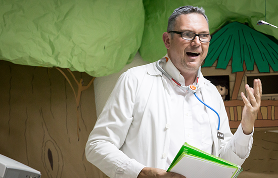 Alpedrete, Spain—The Alpedrete Church’s VBS theme “Journey off the Map” explored Bible lessons demonstrating how Daniel and his three friends followed God. During the daily opening assembly, a mission’s moment focused on the hospital in Doropo, Côte d’Ivoire, founded by missionary Dr. Laverne Miley. Dr. Miley (performed by Anthony Edgmon as pictured below) visited one day, giving students more insight about the hospital.