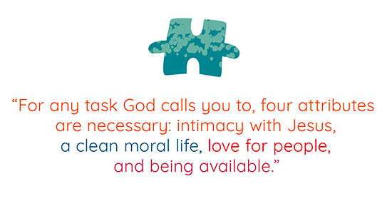 I asked Mrs. Miley for advice regarding mentoring and discipling across generations. She replied, “I wouldn’t have any advice to give; that’s what experts do, and I don’t qualify there. However, for any task God calls you to, four attributes are necessary: intimacy with Jesus, a clean moral life, love for people, and being available.”